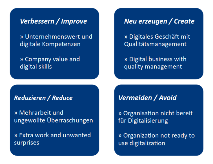 Nutzen: mit wenigen Arbeitstagen Aufwand die Ausgangslage und Möglichkeiten strukturiert erfassen, verbunden mit konkreter Vorgehensplanung für Innovationen und Massnahmen.